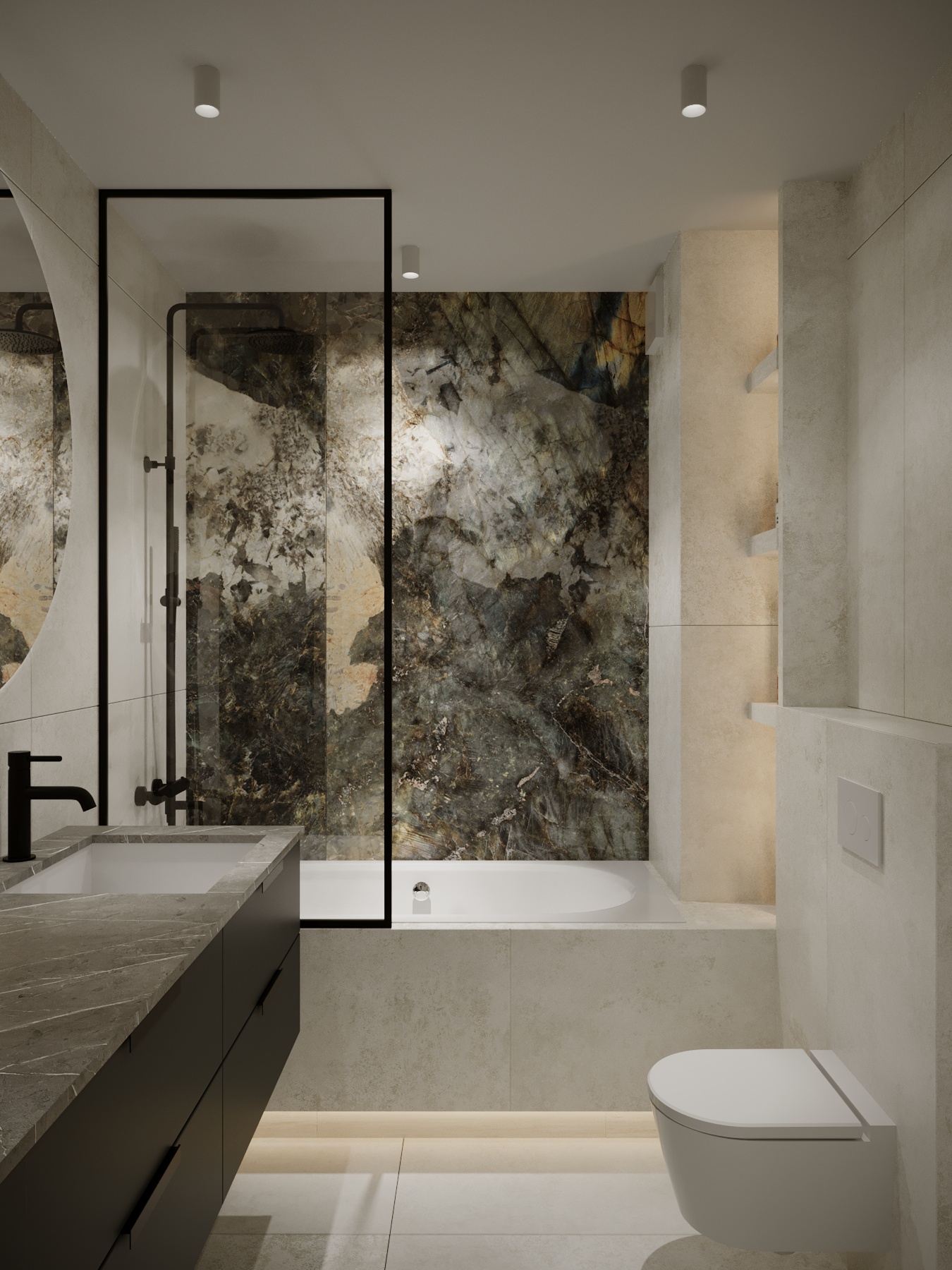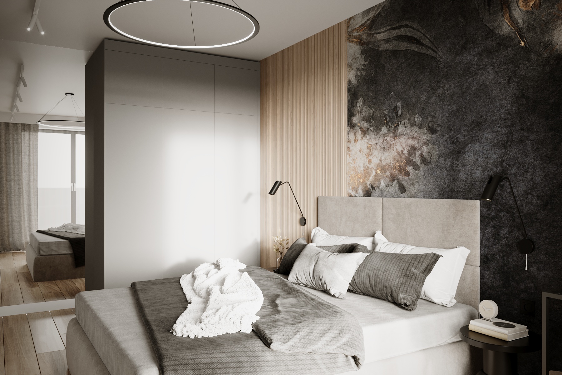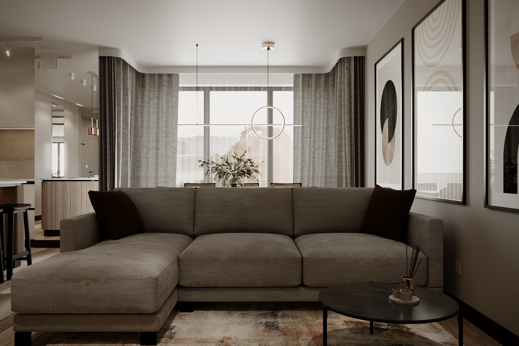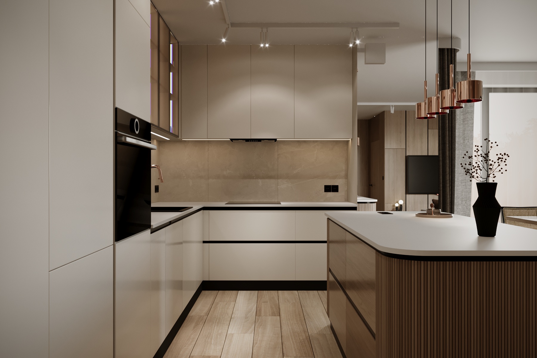 To wnętrze to doskonałe rozwiązanie dla osób ceniących ciepłe, naturalne kolory i eleganckie akcenty. Beżowa baza, granatowe elementy oraz miedziane detale tworzą harmonijną i stylową przestrzeń, idealną do życia. Naturalne drewno, zastosowane w meblach i podłogach, dodaje wnętrzu komfortu i przytulności, tworząc miejsce, w którym chce się przebywać.